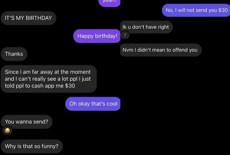 The best part is the message where they call this "friend" poor and then say they didn't mean to offend them. People aren't poor just because they don't want to send you money.