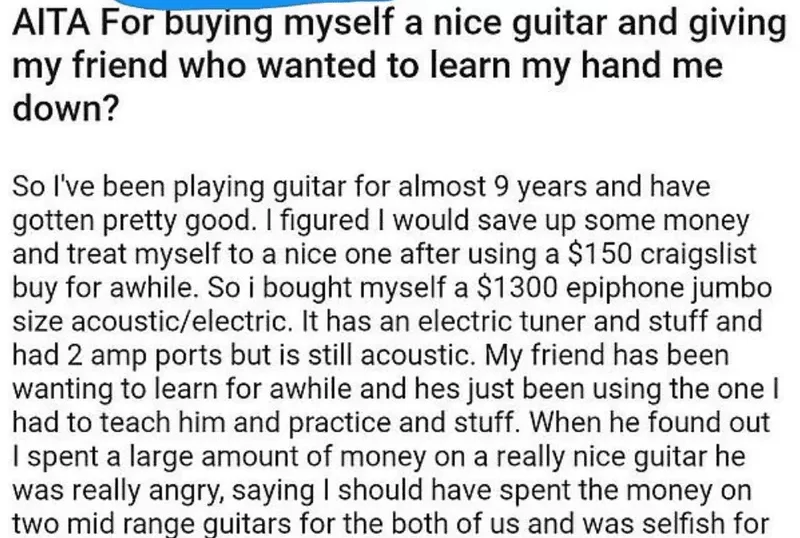 Unless this friend actually contributed half the money to that $1300 guitar fund, it's just plain silly to expect the poster to "think of him." He's getting a free guitar out of the situation! Does he not realize how expensive guitars are?!