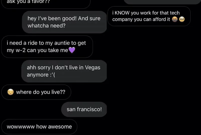 If you're asking for a favor from a friend, it's typical to ask someone you know really well and trust. You don't reach out to random Facebook friends you haven't spoken to in ages - at least, you don't unless you're this person.
