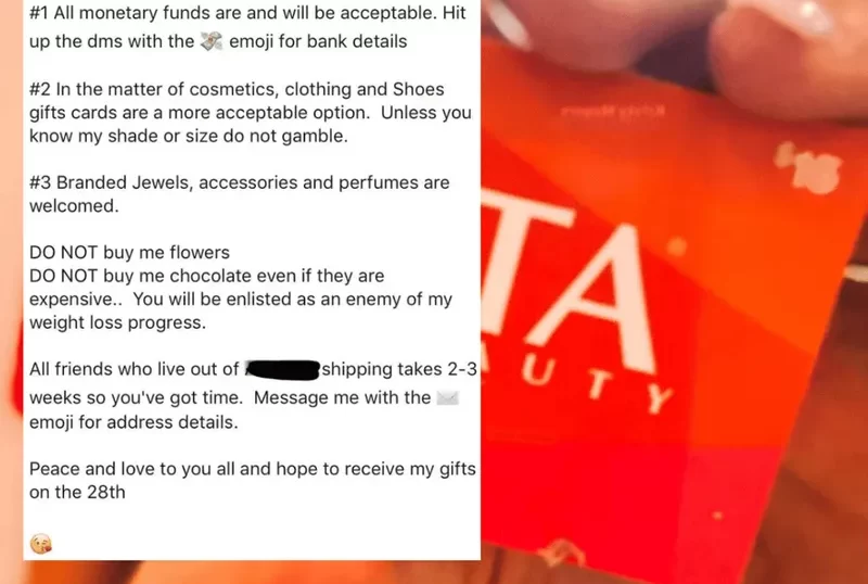 This girl didn't get that memo, though, and had the gall to give a weirdly specific, demanding gift list to her entire Facebook feed. Apparently, she also never learned that most Facebook friends aren't real friends. That'll be a tough wake-up call.