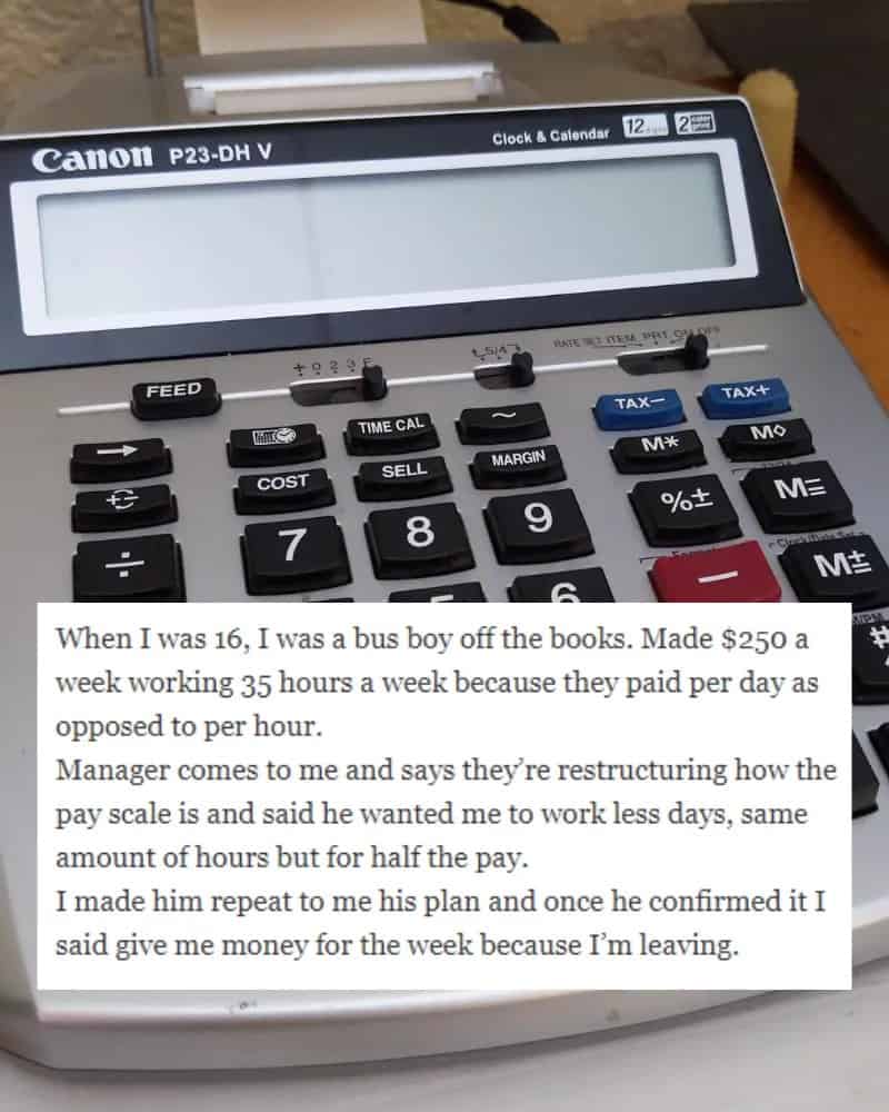 Regardless of how the hours were distributed, the employee was still doing the same amount of work for less money. At that point, it became clear that staying in such a situation was not worthwhile, prompting their decision to quit.