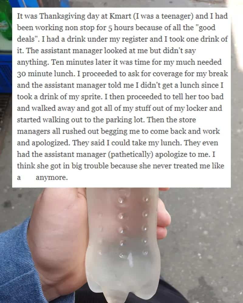 In this case, the manager attempted to deny a teenager their lunch break for taking a drink while working the register. Recognizing the situation's injustice, other store managers swiftly intervened to stop this "I quit" moment.