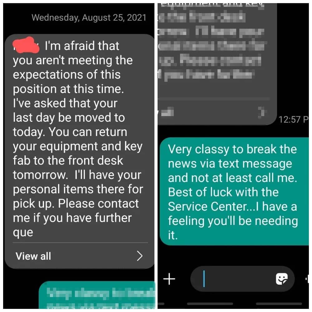 Any form of communication other than a text message would have demonstrated basic respect for the employee. In this case, the person who received the text message might be better off seeking employment elsewhere, potentially avoiding further issues.