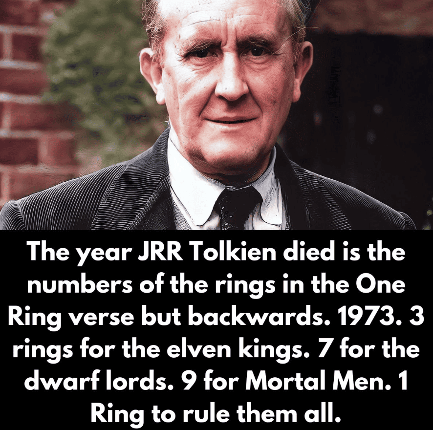 In a curious twist of fate (or perhaps not a twist at all), the year of J.R.R. Tolkien's departure aligns with the number of rings mentioned in reverse order in the One Ring verse. J.R.R. Tolkien bid farewell to this world in 1973. The relevant verse is depicted in the accompanying image. This coincidence adds a fascinating and somewhat eerie layer to his legacy, though it undeniably retains its coolness!