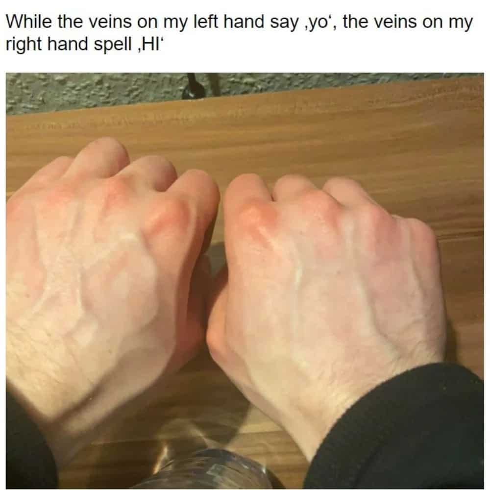Sometimes, the peculiarities we encounter can be so astonishing that we need to show someone else to confirm that they truly exist. In this instance, the person's veins have formed a remarkable pattern that spells out the word "hello." It's an unusual phenomenon that demands attention and validation.