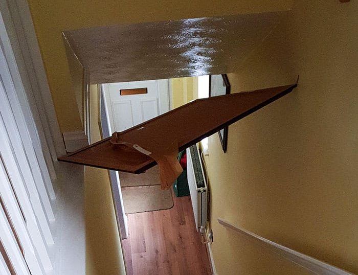 This image looks like a disaster frozen in midair. A huge picture frame fell from a stairwell wall and should have crashed into the steps below. Instead, it somehow lodged itself tightly between the banister and the wall. One more inch in either direction and the frame would have shattered into pieces.