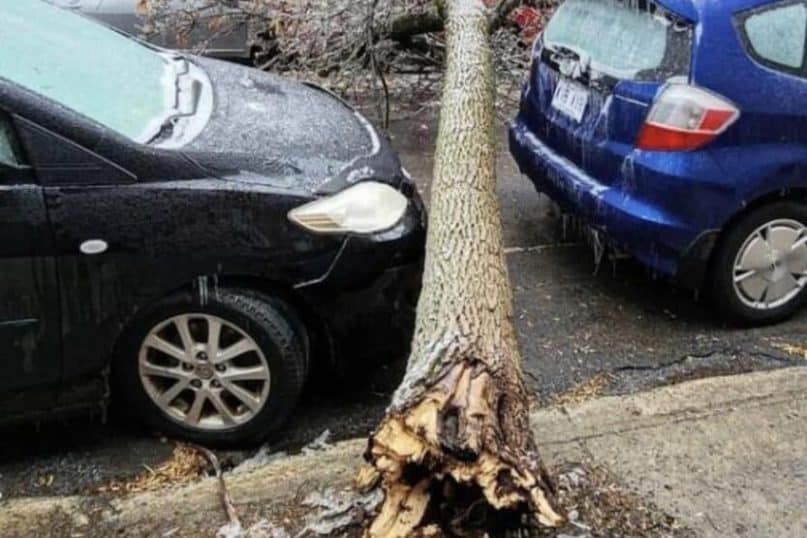 When trees fall, they usually leave destruction behind. But this one must have been feeling gracious. A rotted tree finally gave way and collapsed onto a busy winter street. Miraculously, it fell directly between two parked cars without touching either one.