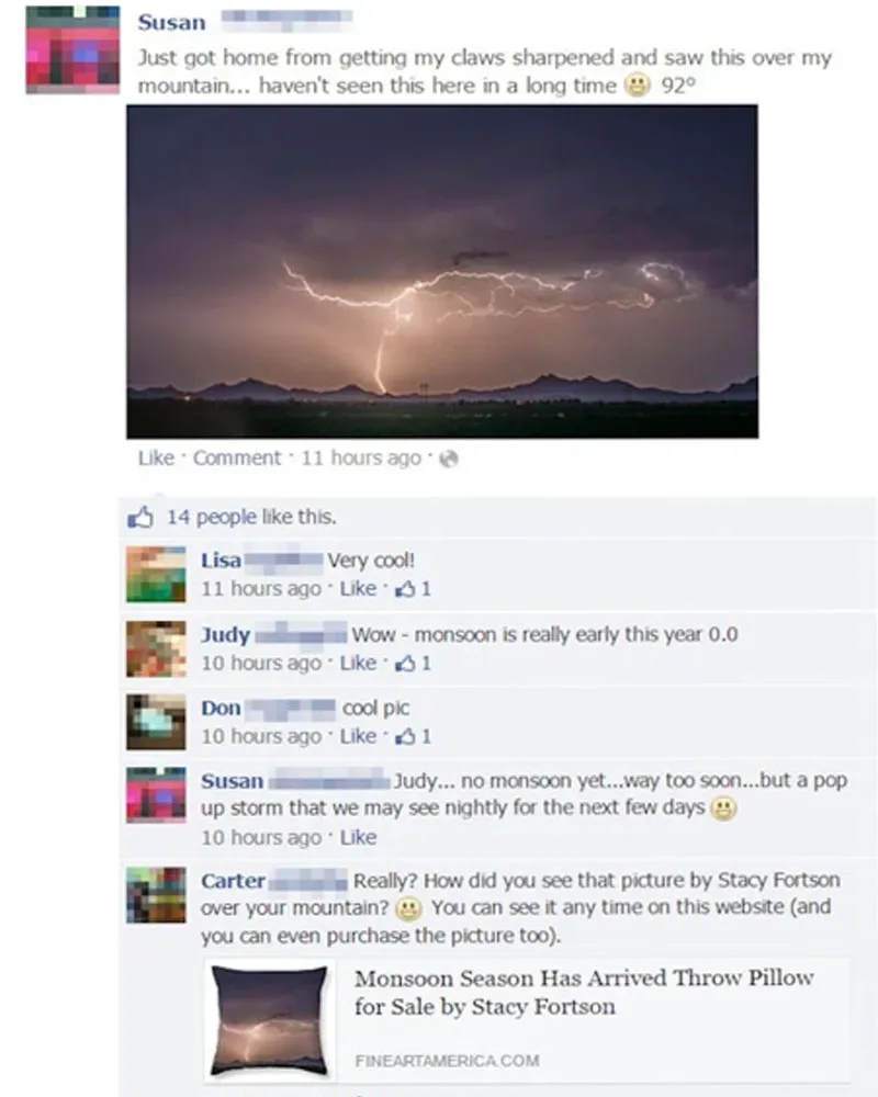 Although Susan was quick to deny it was a monsoon, her lies fell silent when a sharp-eyed Carter pointed out the truth. Faced with the choice of buying the picture online or opting for the throw pillows sold by