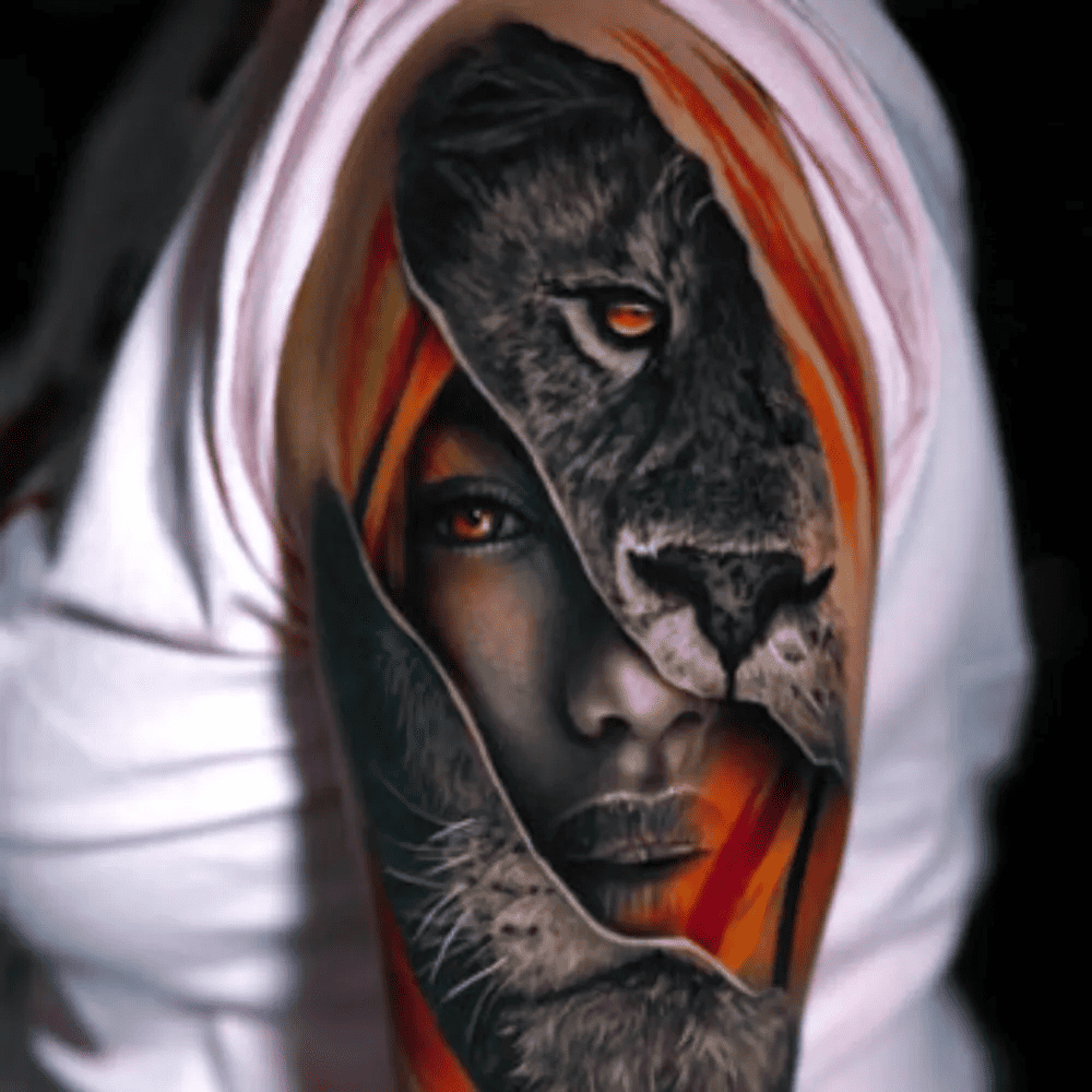 They say that behind every successful man stands a strong woman, and it appears that this tattoo seeks to capture the essence of that age-old saying. At first glance, the image of a powerful and imposing lion confronts us, exuding an aura of dominance.