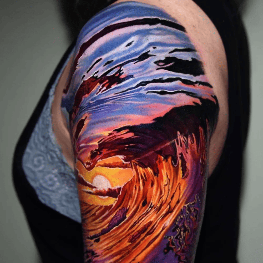 Transporting us to the realm of sun-soaked beaches and azure waves, this 3D tattoo exudes an irresistible allure. The vibrant colors employed in this artwork perfectly capture the natural beauty of a sunset, offering a visual feast for the senses.
