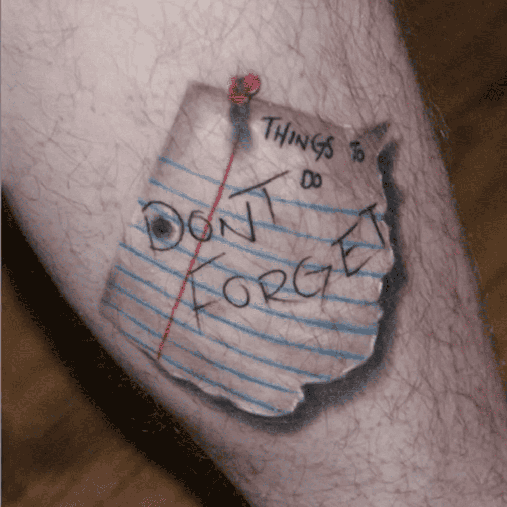Regardless of its purpose, the hyper-realistic artwork gives the illusion that the wind might carry away the depicted piece of paper at any moment. The pin's appearance is so convincing that it almost provokes a tactile response as if one could feel the pricking sensation on their skin. Indeed, this is a testament to the convincing nature of this body art.