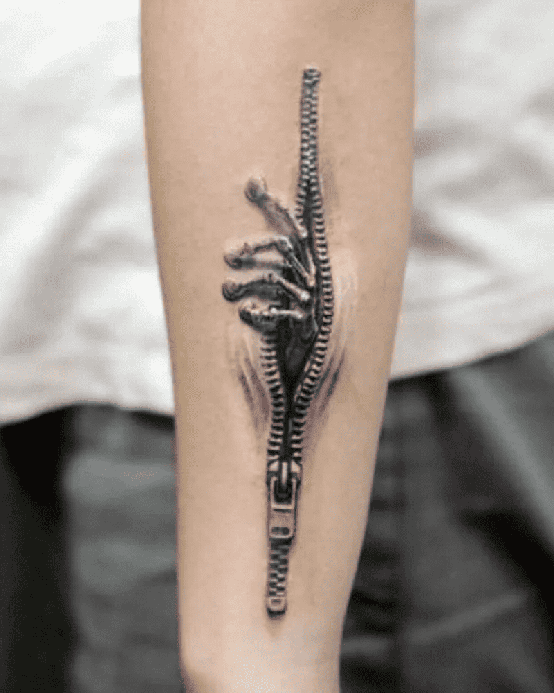 This tattoo offers a striking portrayal of a creature seemingly trapped beneath the wearer's skin, desperately clawing its way out into the world. The interpretation of this imagery remains open-ended – it could symbolize the wearer's inner struggles or simply reflect a captivating design that appealed to them as a tattoo.