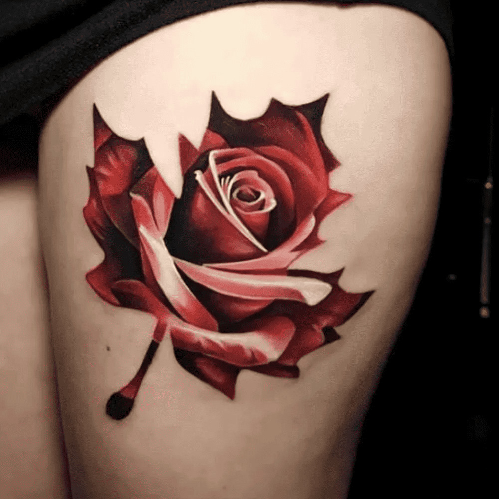 This tattoo combines the natural elegance of a leaf with the timeless beauty of a rose, offering a harmonious fusion of two distinct elements. It's as if the wearer couldn't decide between these two symbolic motifs, ultimately choosing to celebrate both in a single piece of body art. The result is a breathtaking composition that seamlessly blends organic and floral aesthetics, creating a visually stunning and unique design.
